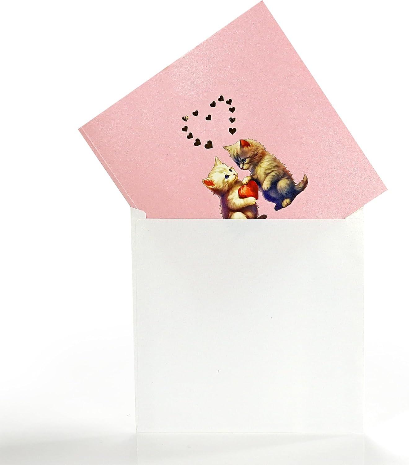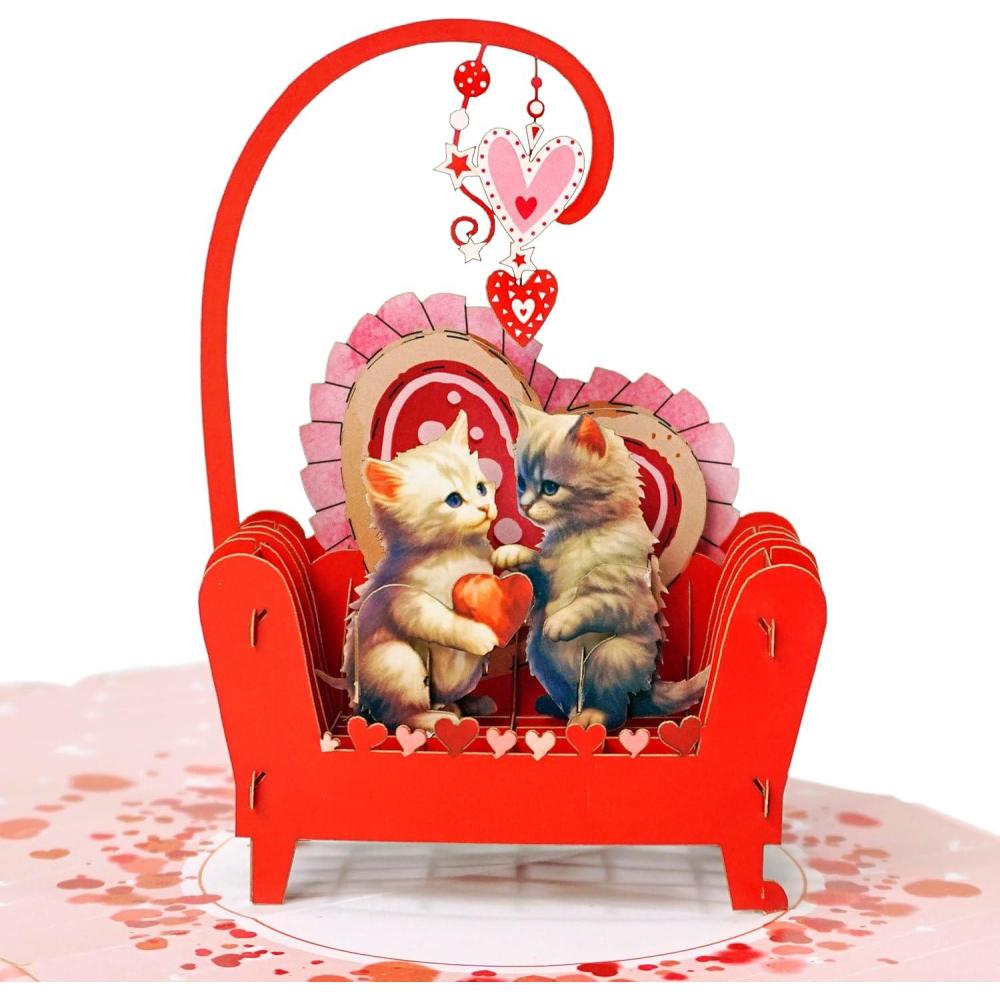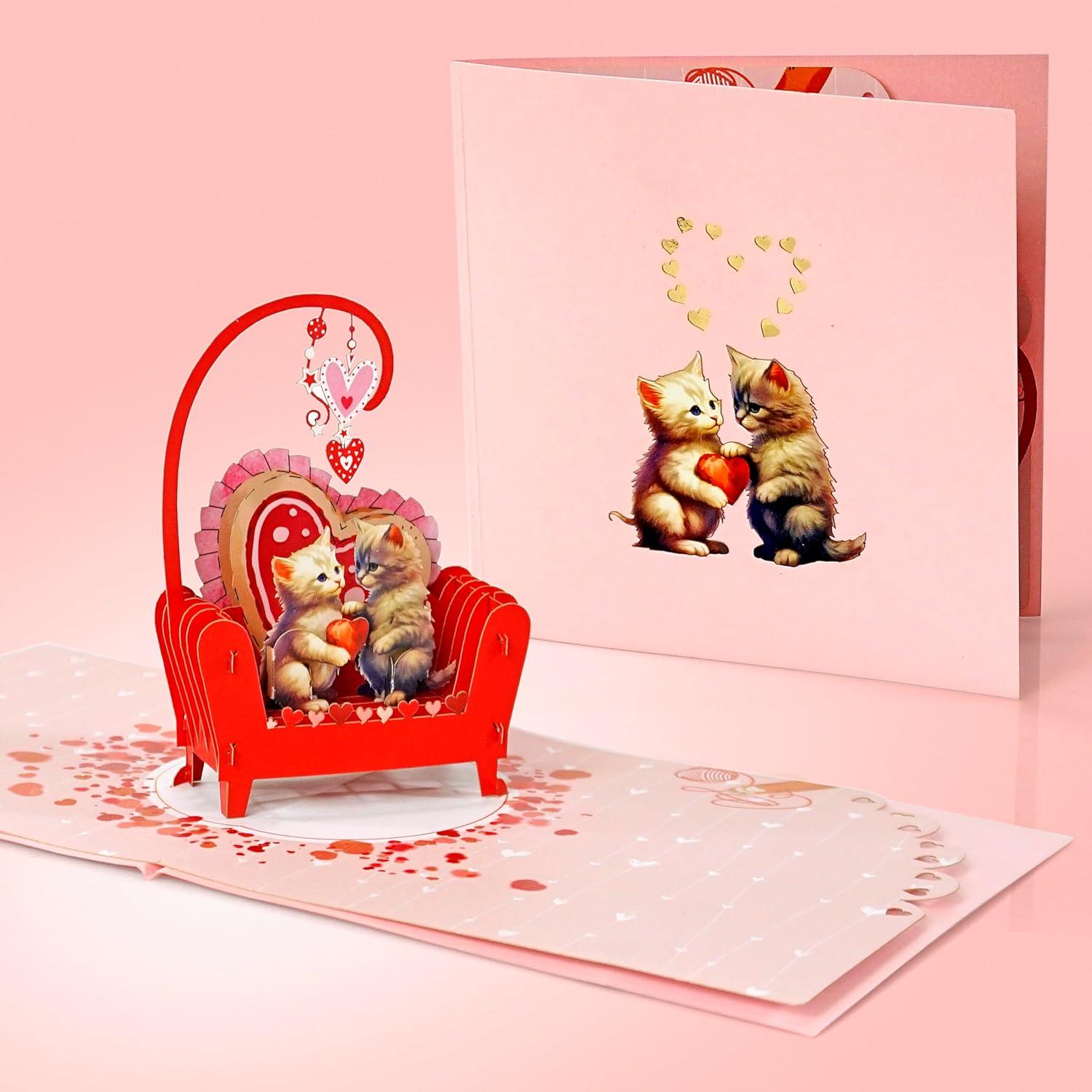 UNIQUE DESIGN: A pop-up card that, when opened, reveals an adorable cat couple snuggled together on a cozy sofa, lovingly holding a bright red heart between them.
